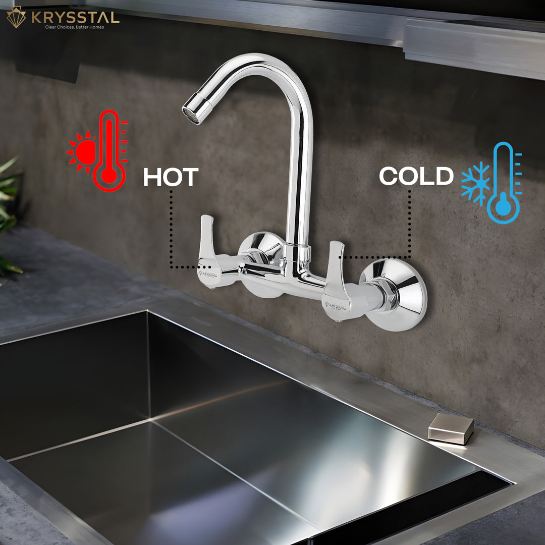 A wall mount kitchen sink mixer tap with double handle is installed on the wall above the sink and features two separate handles — one for hot water and one for cold — giving you precise control over water temperature and flow.