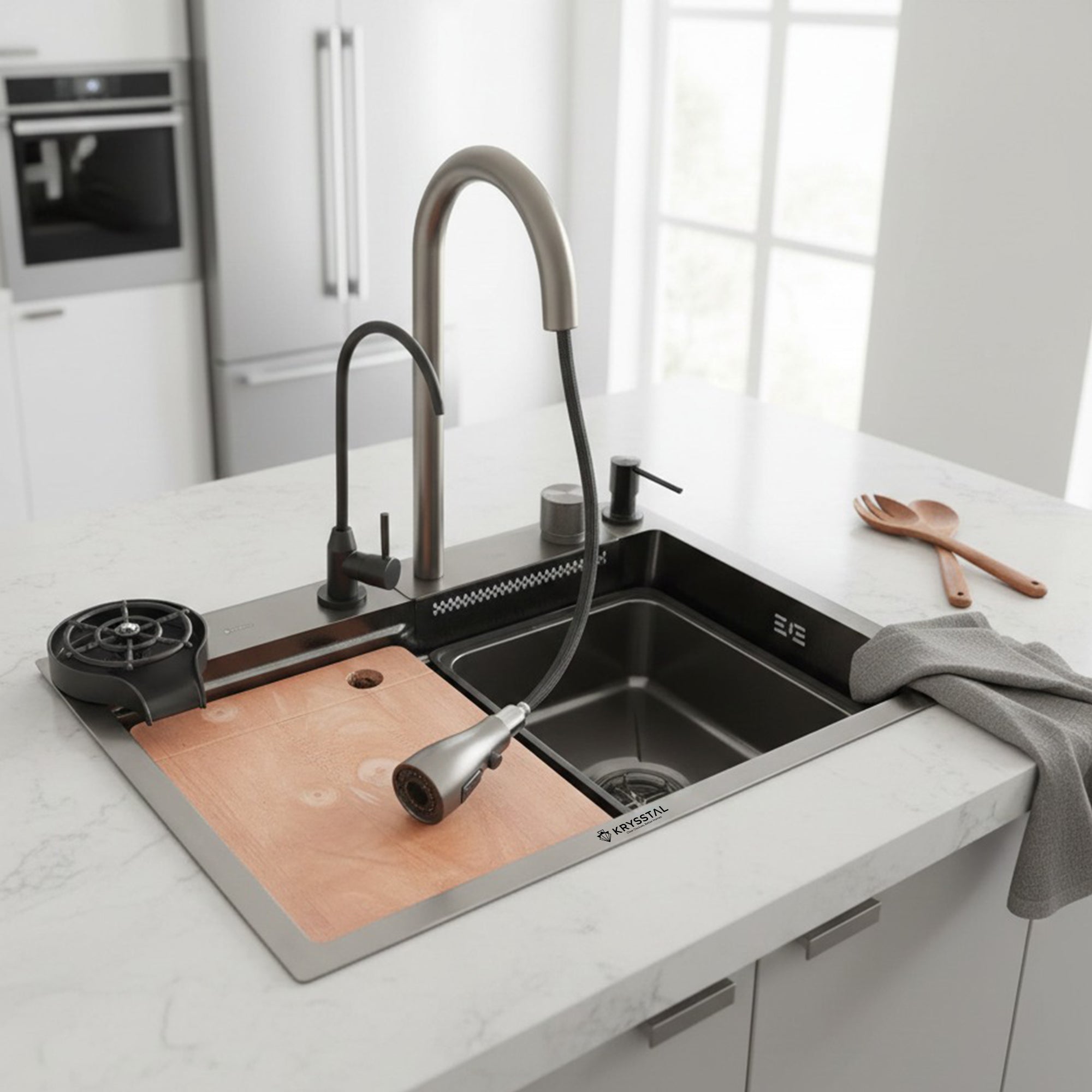Absolutely! KRYSSTAL smart sinks are designed to complement modern modular kitchens, with features like sleek finishes, pull-out faucets, and multifunctional accessories that elevate kitchen aesthetics and functionality.