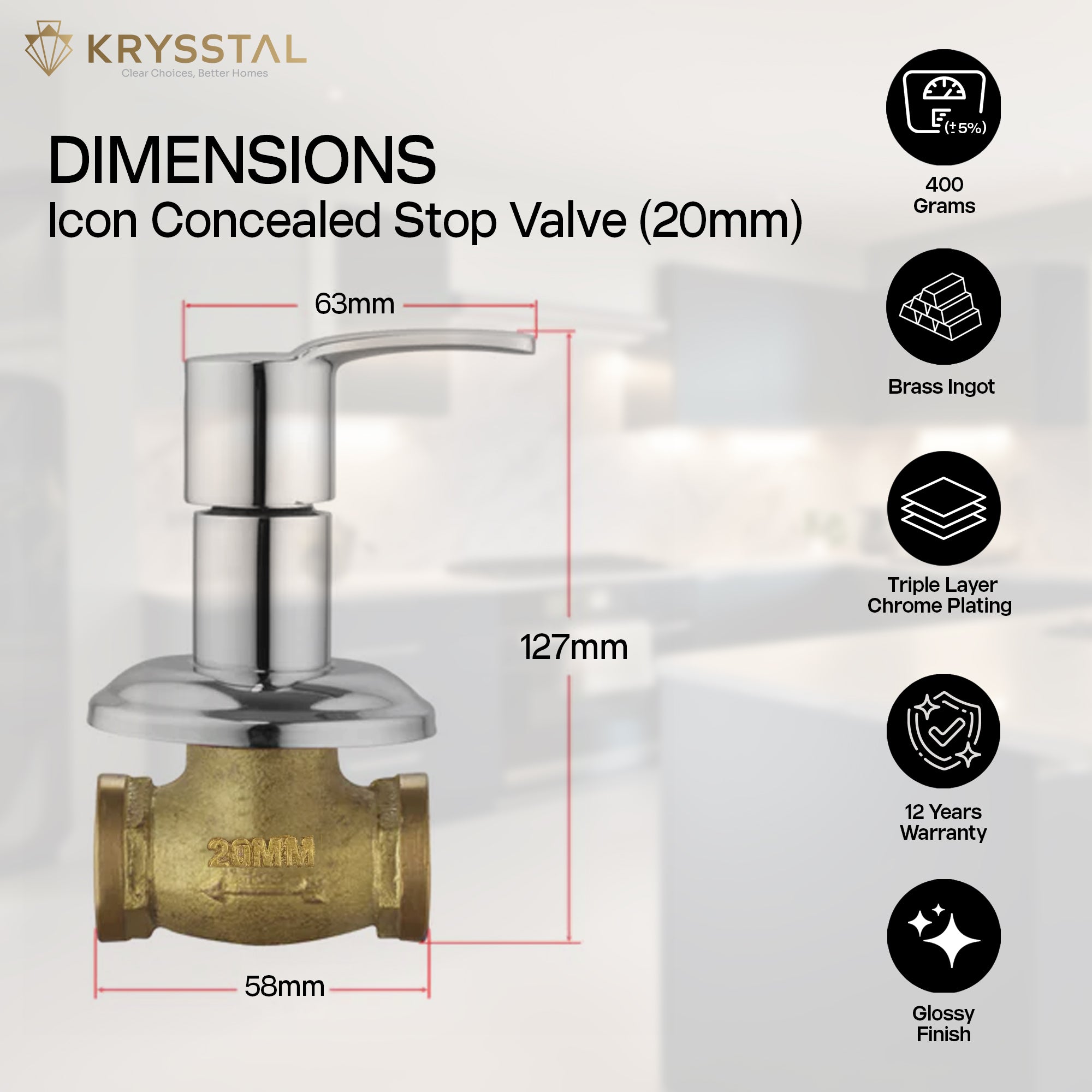 The Icon Concealed Stop Valve (20mm) is made from solid brass with a durable triple-layer chrome finish that resists rust, corrosion, and heat. Its 20mm size allows high water flow for rain showers and bath spouts, while keeping your space neat. Designed to prevent leaks, it delivers steady water flow at 60 LPM under 2 BAR pressure. The smooth quarter-turn handle ensures easy, drip-free control. Built to last over 500,000 uses and simple to clean, this valve offers reliable performance with minimal upkeep.