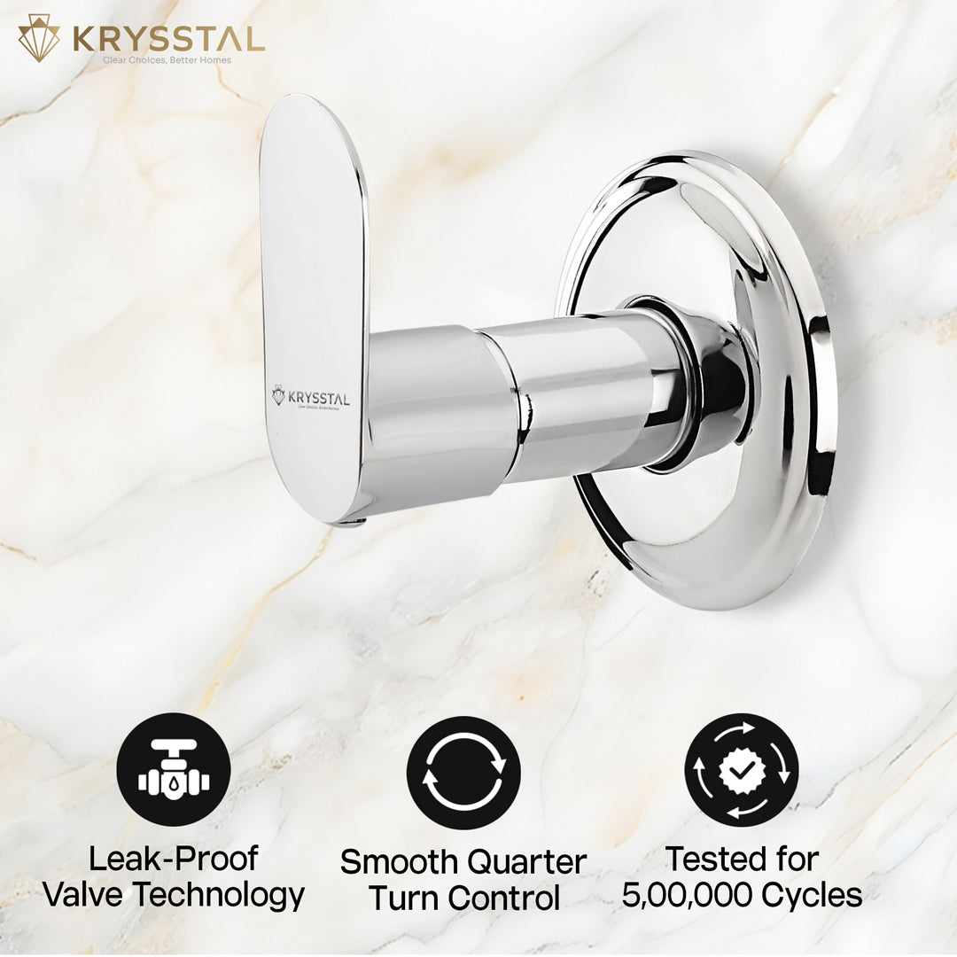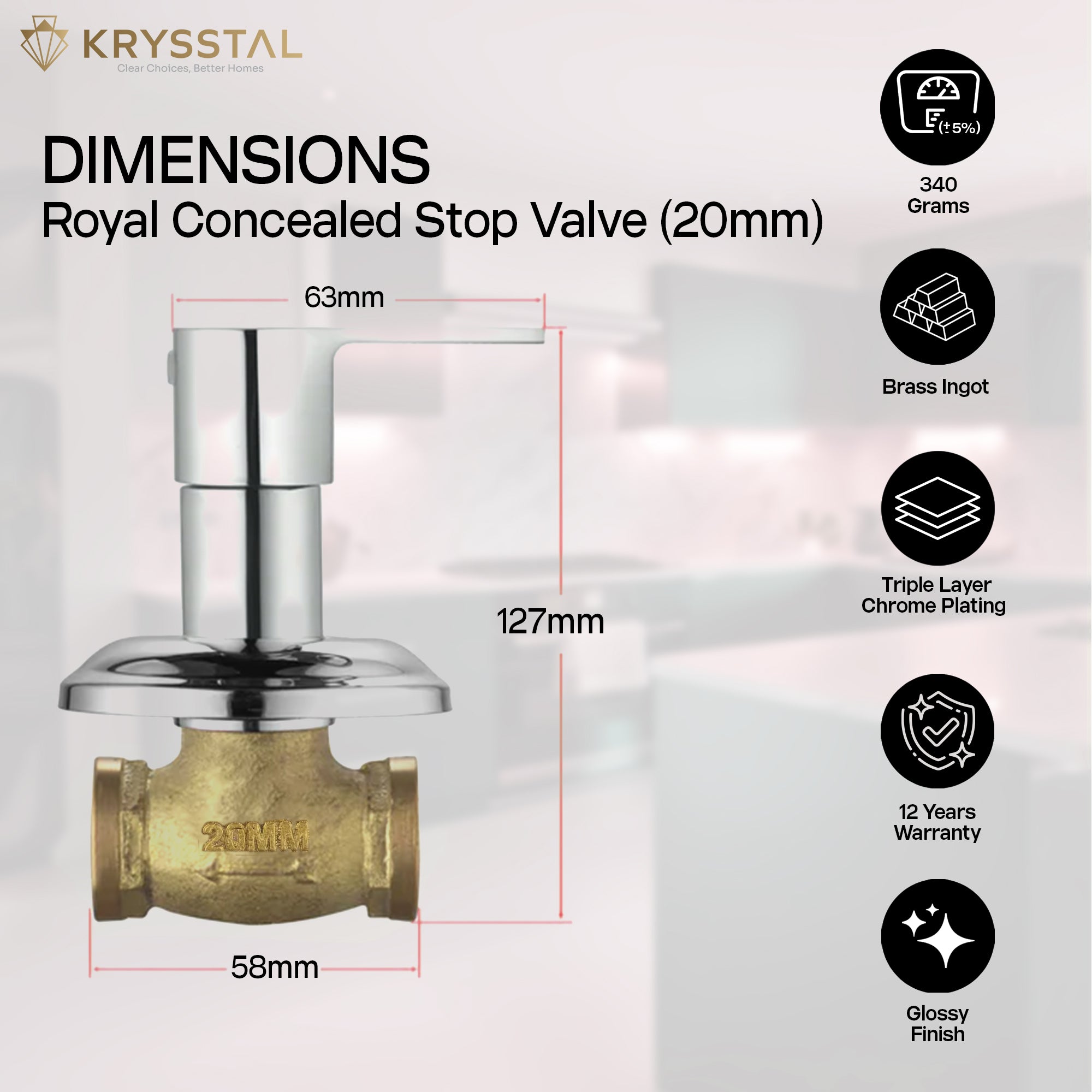 The Royal Concealed Stop Valve (20mm) is made from solid brass with a triple-layer chrome finish that resists rust, corrosion, and heat. Its 20mm size supports high water flow for rain showers and bath spouts, while keeping your bathroom sleek and tidy. Designed for leak-proof use at 60 LPM under 2 BAR pressure, it features a smooth quarter-turn handle for reliable, drip-free control. Built to handle over 500,000 uses and easy to clean, it offers lasting performance and hassle-free maintenance.