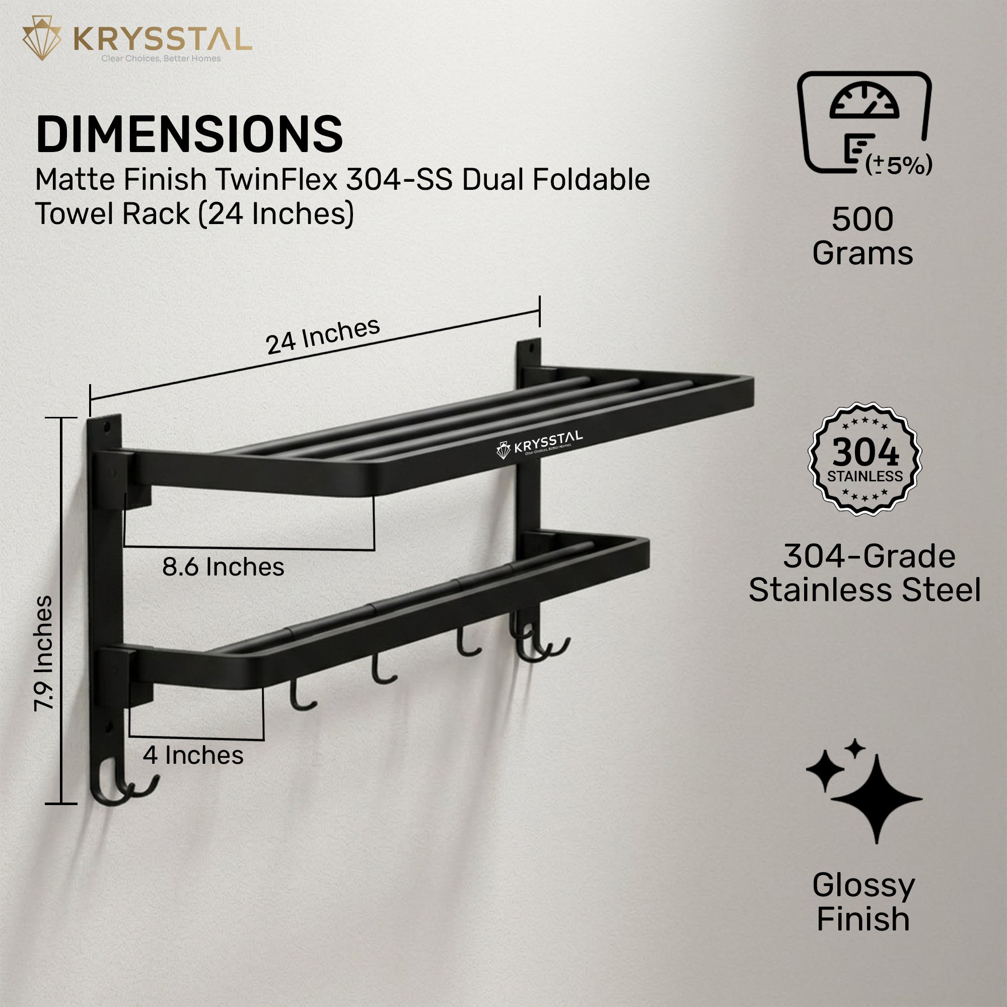 This 24-inch TwinFlex towel rack is made from durable stainless steel with a stylish black matte finish that resists rust and corrosion. Its foldable design saves space, perfect for small or modern bathrooms. With two racks and hooks, it keeps towels and clothes organized. Strongly built to support heavy loads, it’s reliable for daily use.