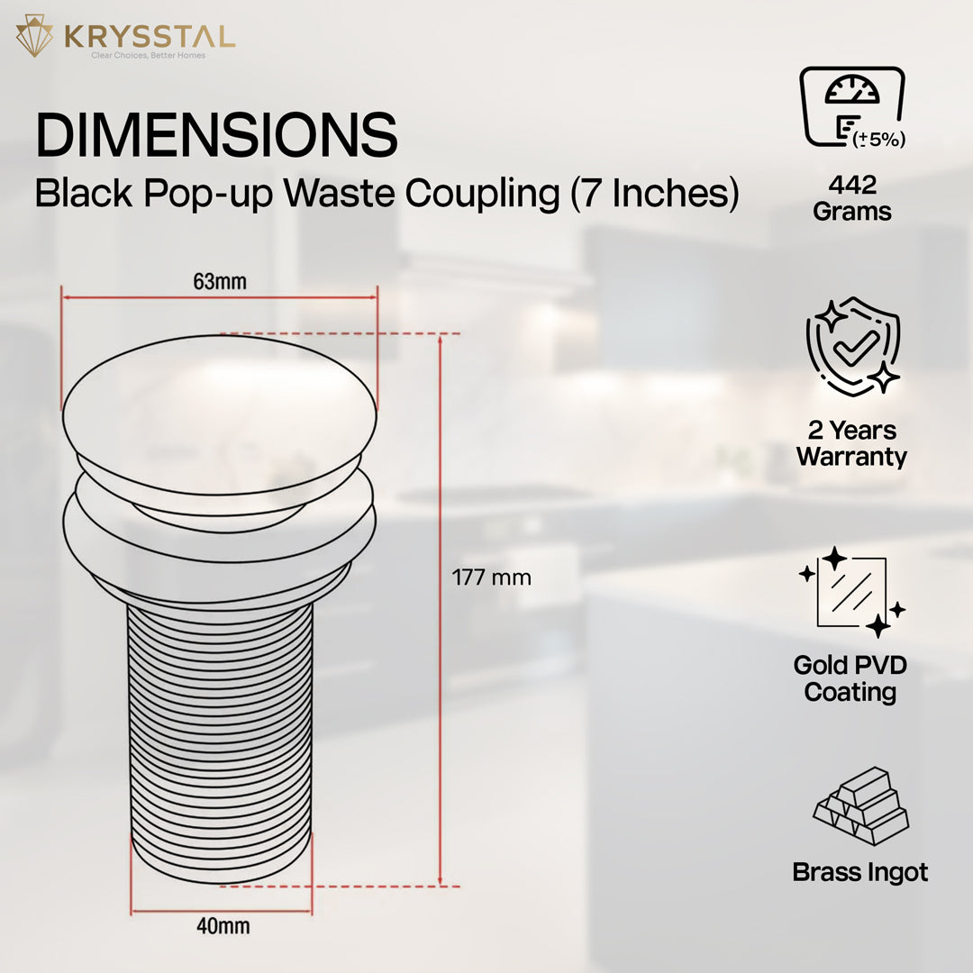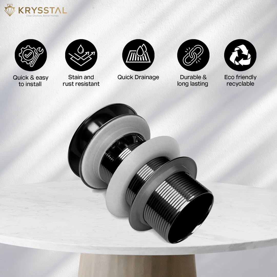 Most KRYSSTAL PVD pop-up waste couplings are 1¼" (≈32 mm, BSP)—a universal fit for standard bathroom sink waste holes in India.