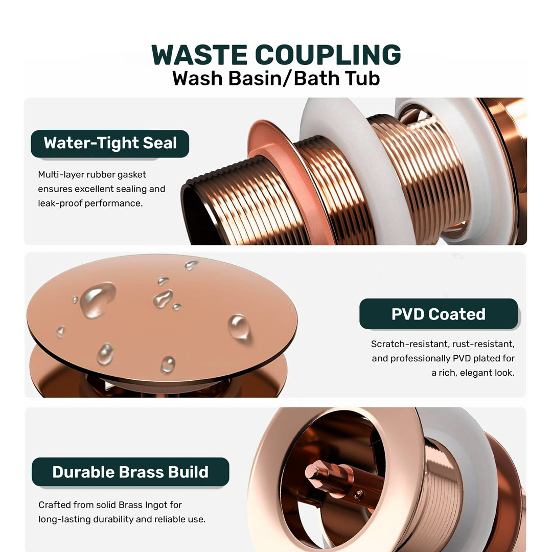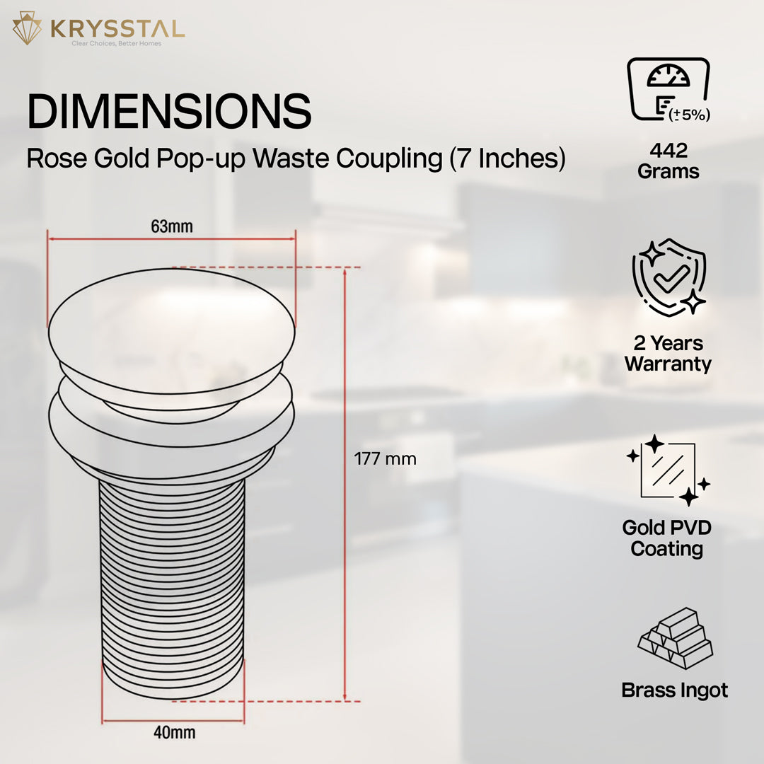 The Rose Gold Pop-up Waste Coupling (7 Inches) is made from solid brass for long-lasting durability. Its rose gold PVD finish protects against corrosion and wear, keeping it looking new. The easy one-press pop-up offers quick, clog-free drainage. With a leak-proof seal and longer threaded shank, it securely fits both thin and thick basins without leaks.